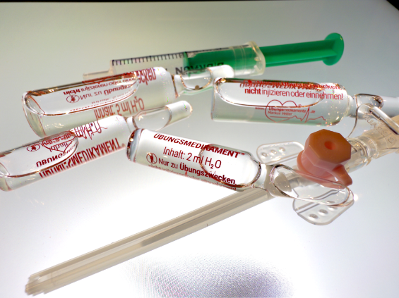 Unsere Notfalltrainings für Arztpraxen sind so realistisch wie möglich gestaltet. Dazu gehört auch der Umgang mit Notfallmedikamenten – natürlich ohne echte Wirkstoffe. Die verwendeten Ampullen, Spritzen und Infusionen sind Übungsmaterial (Übungsmedikamente von Markus Vetter) und absolut ungefährlich.